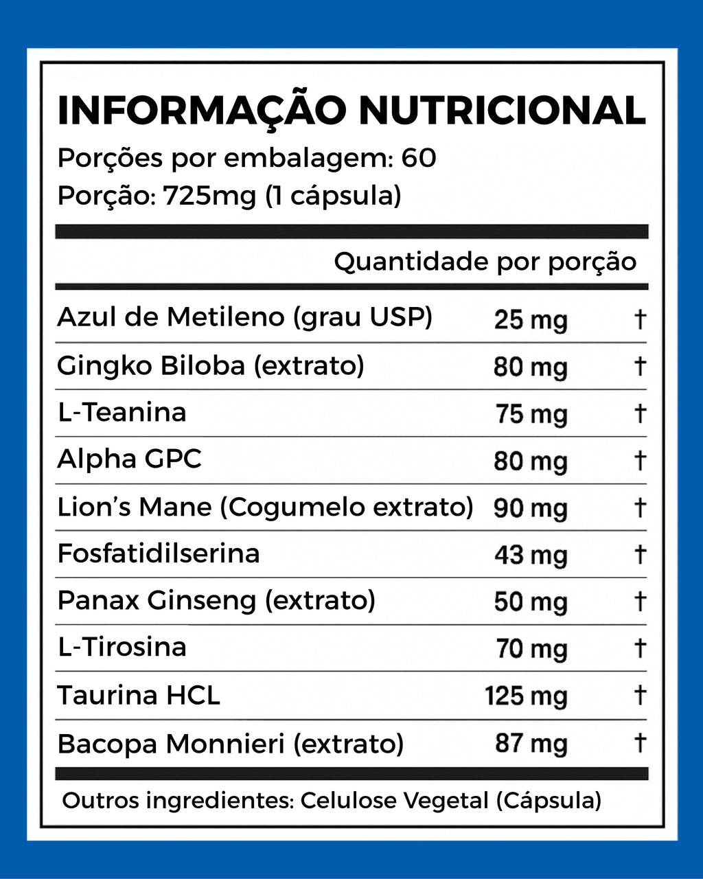 Pela primeira vez, o azul de metileno estimulante foi encapsulado em uma fórmula ultra premium, somado aos nootrópicos mais poderosos da atualidade, entregando foco extremo, energia estável e expansão mental sem precedentes.