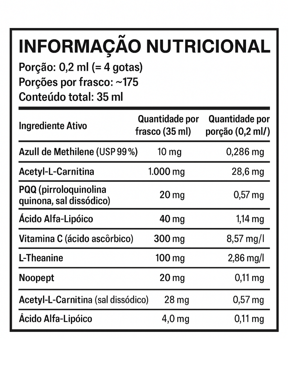 Formulado em versão líquida sublingual, ele combina Azul de Metileno (USP 99%) com um blend estratégico de nootrópicos e antioxidantes premium que trabalham em sinergia mitocondrial para elevar sua energia, foco, memória e produtividade ao próximo nível.