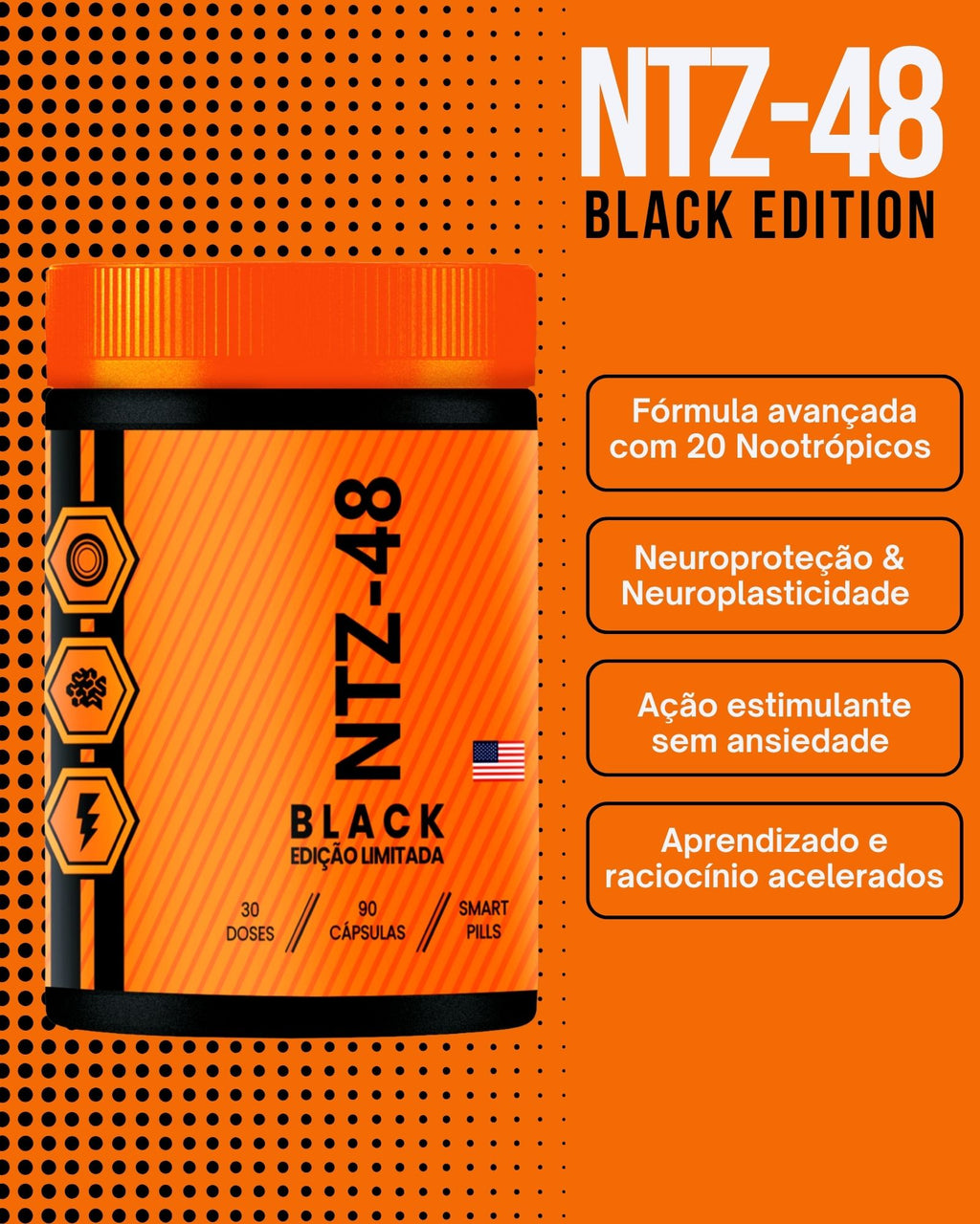O NTZ-48 Black Edition é o Nootrópico mais avançado e potente já desenvolvido pela Neurohacker. Criado para quem exige foco extremo, motivação real e performance mental acima do comum. Possui uma fórmula elaborada com os melhores nootrópicos do mundo atualmente e alta tecnologia cognitiva para você pensar mais rápido, aprender melhor e entrar em ação com clareza total.