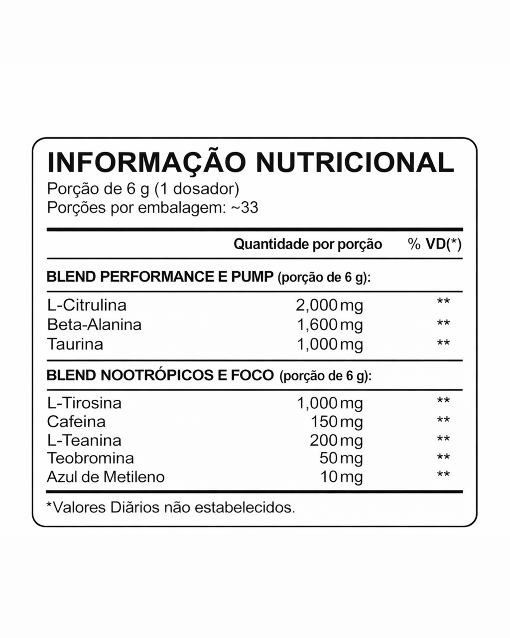 Desenvolvido para quem exige performance física + foco mental absoluto, PSYCHO BLUE combina ingredientes consagrados no mundo dos pré-treinos de alta performance com uma abordagem nootrópica avançada, entregando energia limpa, concentração profunda e resistência real — sem confusão mental ou crash.