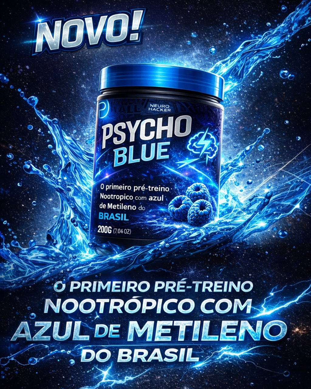PSYCHO BLUE é o primeiro pré-treino do Brasil a incorporar azul de metileno em sua proposta nootrópica.